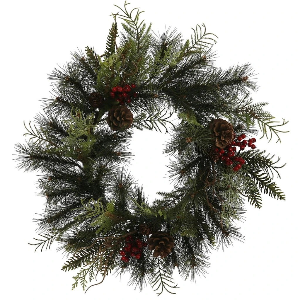 | Manufacturer Description: | 18″ Cedar Cone Berry Pine Wreath (J143322) |